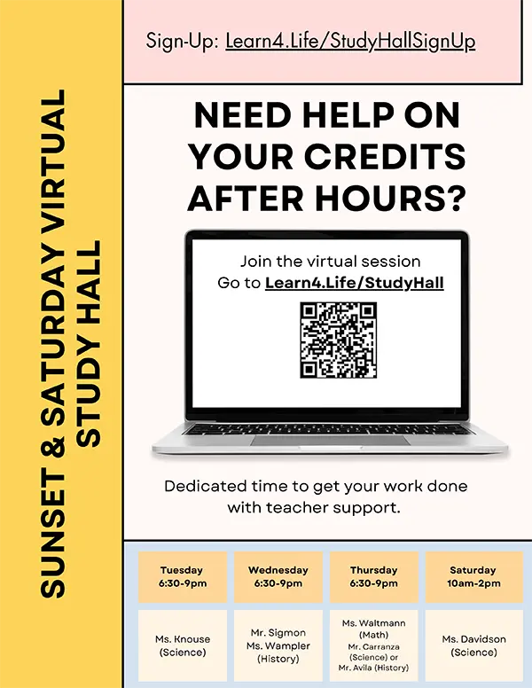 A-G Requirements Sunset and Saturday Study Hall English Spanish Sign-Up for Study HallJoin Study Hall Inscríbete en la sala de estudioÚnete a la sala de estudio
